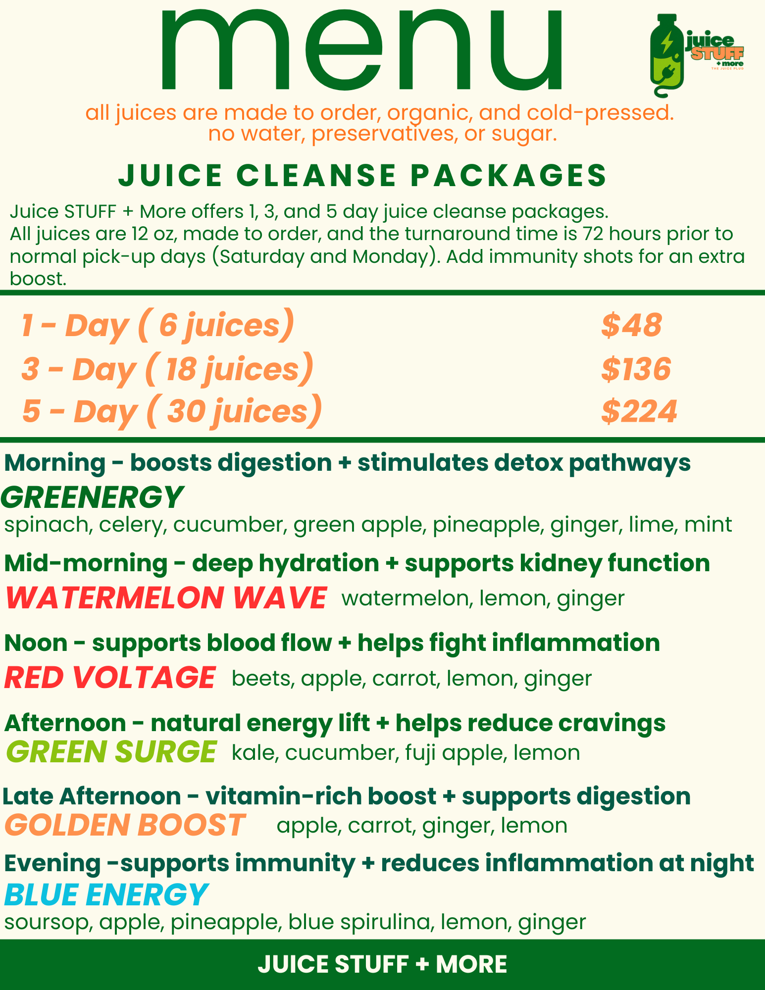 At Juice STUFF + More, we bring you fresh, cold-pressed juices made from high-quality, locally sourced fruits and vegetables. Our mission is simple: to provide clean, flavorful nourishment that supports your lifestyle and helps you stay charged and stay juicy.